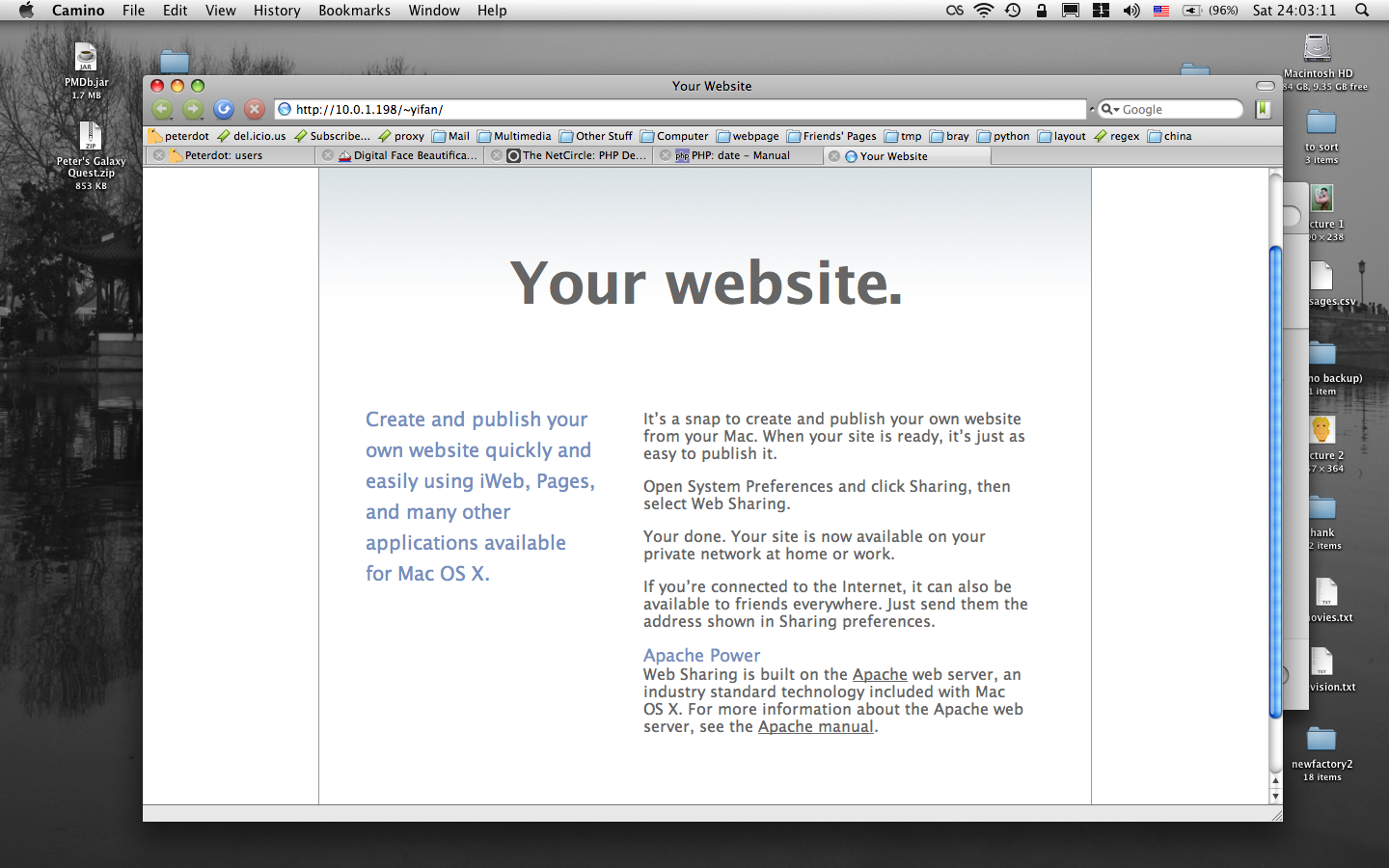 mac os x leopard comes with a webserver already installed, which means you can run a website from your computer. i went to this website to see how it listed all of my websites, and look what i found.